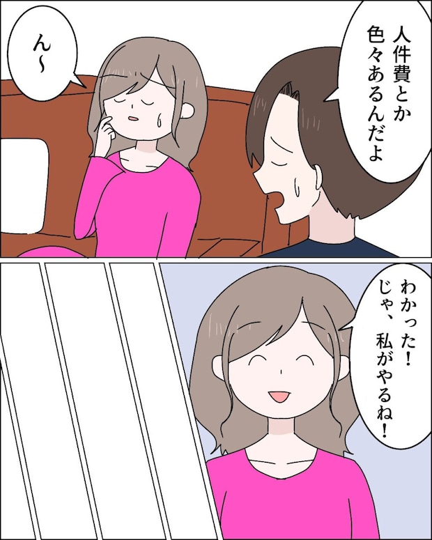 「人件費とか色々あるんだよ」と話すケイさんに、「ん~」と考えた後、「わかった!じゃ、私がやるね!」エリカさんが笑顔で言いました。