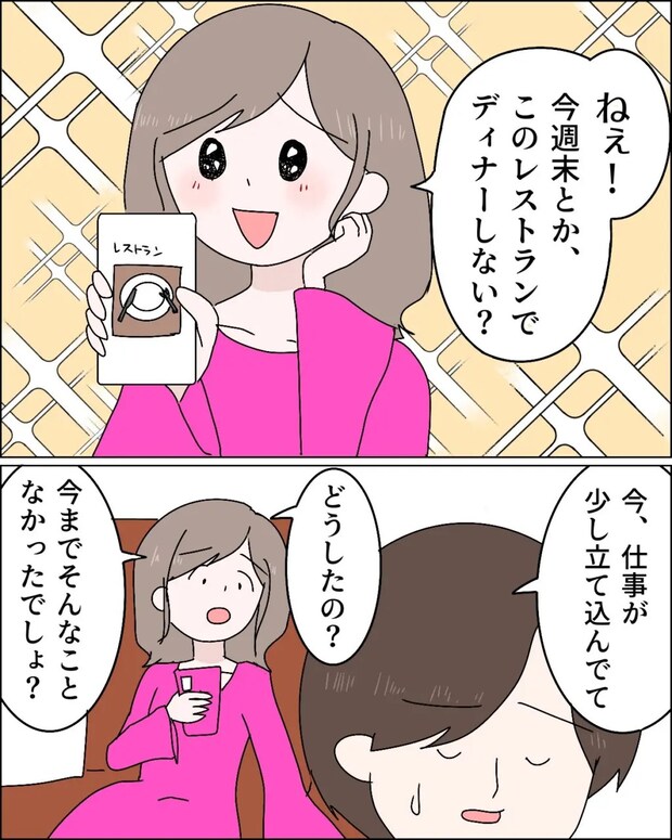 そして、「ねぇ!今週末とか、このレストランでディナーしない?」とウキウキしながらスマホを見せるエリカさんに、「今、仕事が少し立て込んでて」とケイさんが言うと、「どうしたの?今までそんなことなかったでしょ?」と不思議に思いながらそう話すエリカさん。