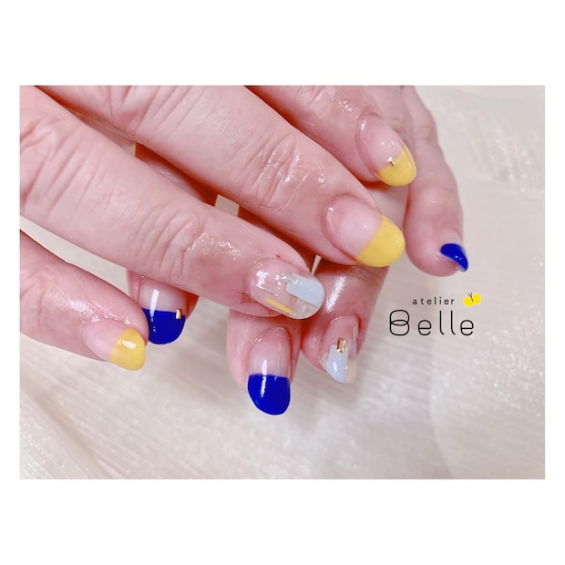 イエローとブルーの鮮やかなネイルカラーを合わせたバイカラーのネイルデザインをご紹介いたします。