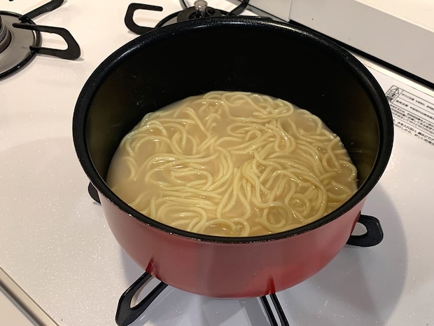 その後、ラーメンを入れて煮ていきます。ほのかに芳醇な香りが漂ってきて、食べる前から「美味しそう!」と感じさせてくれるスープです♪
