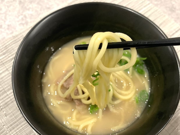 実食してみたところ、味は意外とあっさりめ。見た目から濃厚なとんこつ味も連想できるスープですが、まろやかなコクで食べやすいです!