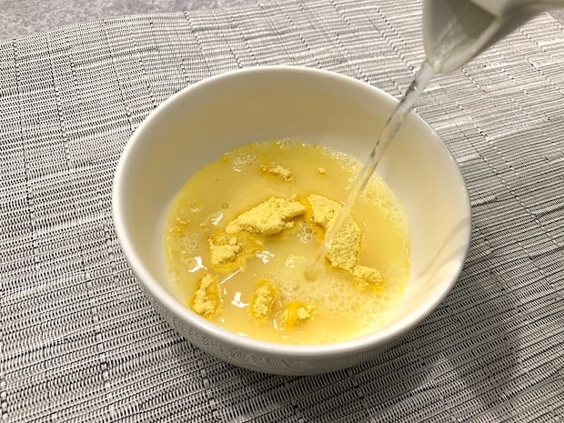 それでは、コーンスープのほうから実食していきます。まず、コーンスープの粉末をお皿に開け、熱湯を180ml注ぎます。