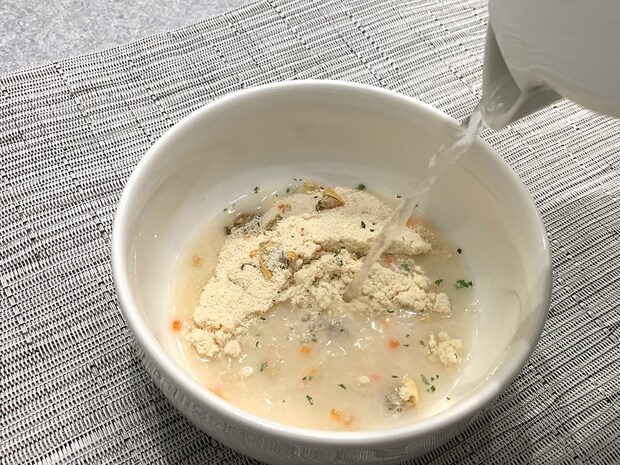 次に、クラムチャウダーを作っていきます。こちらもコーンスープと同様、粉末を器に開けて180mlの熱湯を注ぎます。