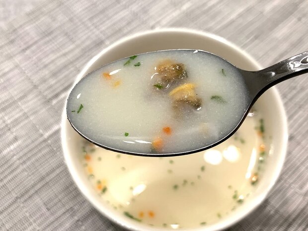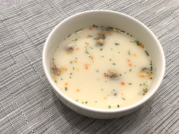 出来上がったクラムチャウダーがこちら。あさり・にんじん・パセリがスープ表面に散らされており、彩りの良さもあります!