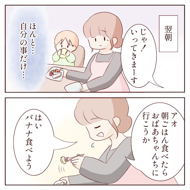 翌朝、家のこともアオくんのお世話も放り出してフットサルに向かったリクさん。相変わらず自分のことだけしかしない夫にヒナさんはため息をつきます。カナコさんとの約束があるヒナさんは、「朝ごはん食べたらおばあちゃんちに行こうか」とアオくんに声をかけ、バナナを食べさせようとしますが・・・。