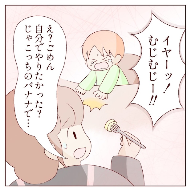 「イヤーッ!むじむじー!」アオくんはテーブルを叩きながら泣き出してしまいました。自分でバナナを食べたかったのか、イヤイヤと暴れます。「え?ごめん自分でやりたかった?じゃこっちのバナナで・・・」ヒナさんは慌ててフォークを持たせようとします。