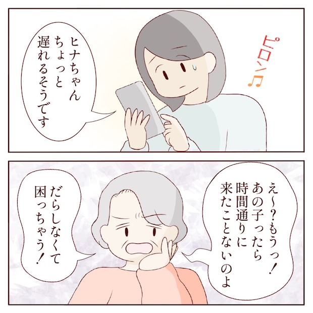 「ヒナちゃん、ちょっと遅れるそうです」スマホの通知を見たカナコさんが義祖母にそう伝えると、「え~?もうっあの子ったら時間通りに来たことないのよ、だらしなくて困っちゃう!」と呆れながら言いました。