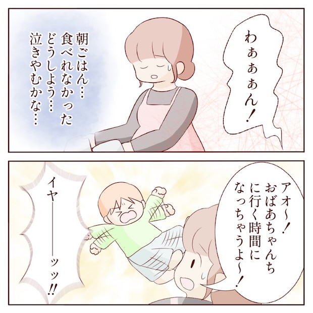 床に散らばったご飯を片付けながら、ヒナさんはため息をつきます。「アオ~!おばあちゃんちに行く時間になっちゃうよ~!」と声をかけても、返ってくるのは「イヤーッ!」と泣き声ばかりでまったく落ち着く気配がありません。とても間に合いそうにないと思ったヒナさんは、カナコさんへ「少し遅れます」と連絡しました。