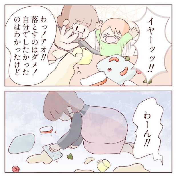 しかし、アオくんの機嫌は直りません。「イヤーッ!」と叫びながら食器やコップをひっくり返し、もっと泣き出してしまいました。「アオ!落とすのはダメ!自分でしたかったのはわかったけど」ヒナさんは慌てて止めようとしますが、せっかく作った朝ごはんは床に散らばってしまいました。