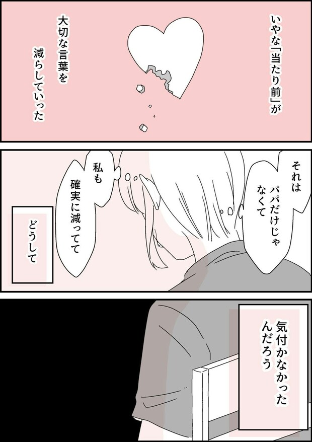 自分が家事をやっていることが当たり前になり、感謝の言葉がなくなってしまったことに寂しさを覚えるまことさん。しかし、それは自分も同じなのではないかと気が付きます。