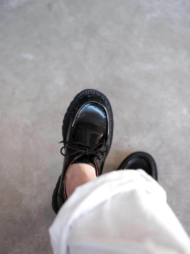 @____.ks__さんのように、ゆとりのある白ボトムと組み合わせると、一気に大人な雰囲気に。レースアップシューズを合わせることで、カジュアルな空気感を残しながらも足元に品をプラスしてくれます。