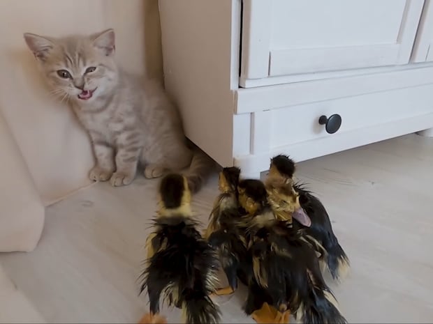 すると……なんということでしょうか。次のシーンでは、アヒルの集団が子猫を見ています。子猫は、壁際に追い詰められてしまいました。