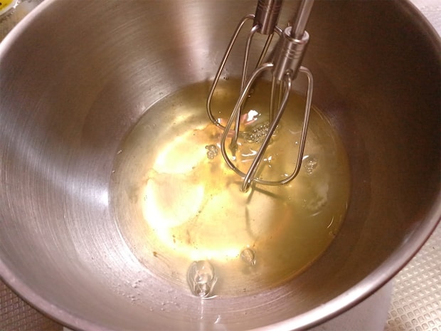 2. 次に、別のボウルに卵白を泡立てて、白っぽくなってきたら残りの砂糖を2回に分けて入れ、ツノが立つまで泡立てる。
