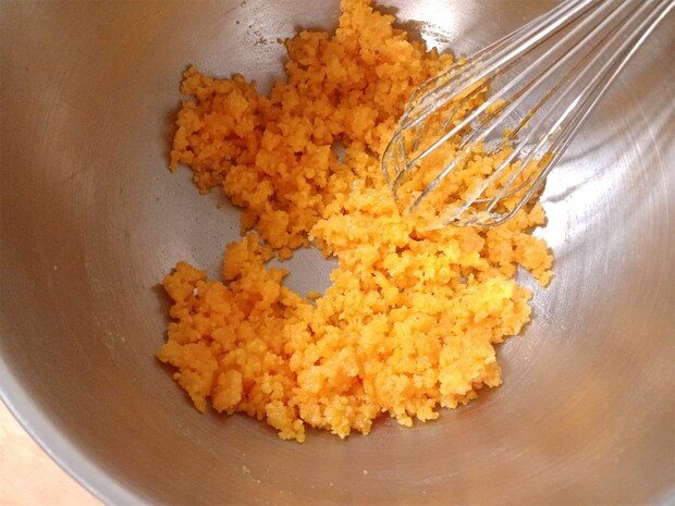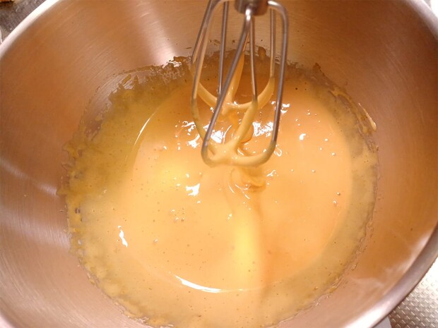 泡立て器を使って、卵黄に砂糖を刷り込むようにしっかり混ぜましょう。