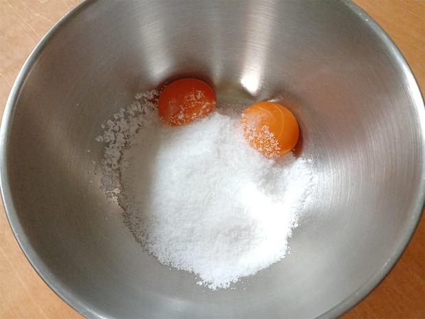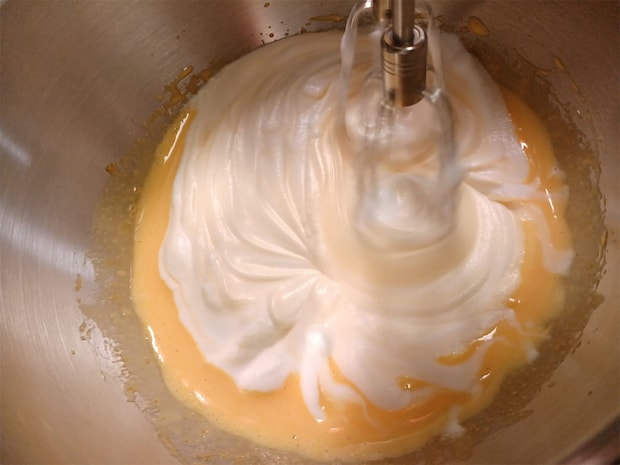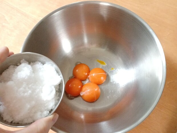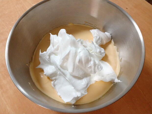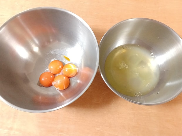 1. 卵は卵黄と卵白に分け、卵黄に砂糖の1/3を入れ、マヨネーズくらいの固さに泡立てておく。