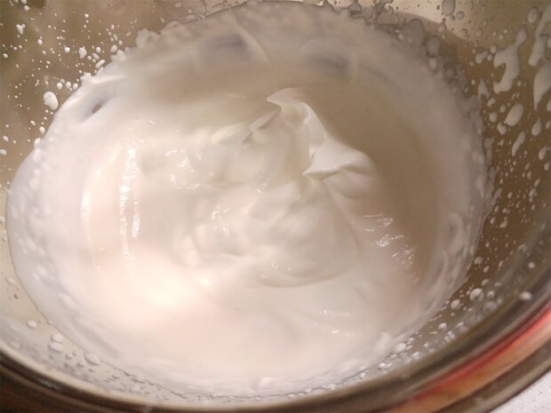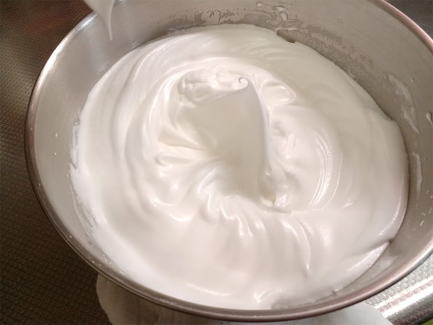 馴染んだら残りを加え、ピンとツノが立つまでしっかり泡立てましょう。