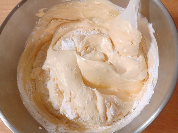 馴染んだら残りのメレンゲを加えて底からすくい上げるように混ぜ合わせます。