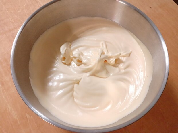 5. ボウルに生クリームを入れて8分立てに泡立てる。粗熱を取ったカスタードを混ぜて出来上がり。