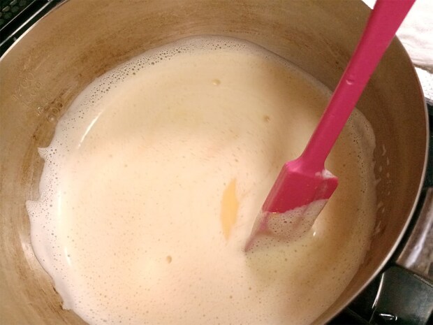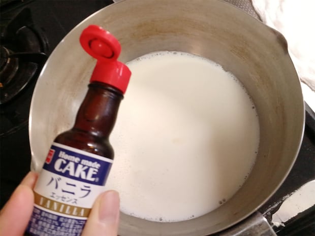 1. 牛乳を煮立て、バニラエッセンスを振り入れる。