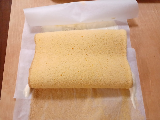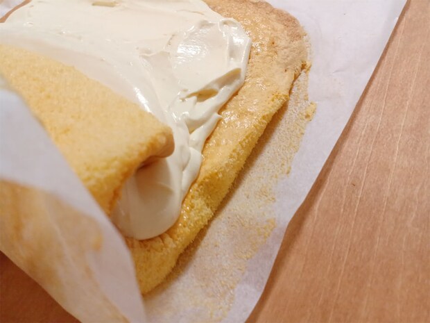 1. スポンジの焼き面を上にしてクッキングシートに乗せ、[シロップ]を塗ってから[米粉カスタードクリーム]を塗り、紙を巻きすにしながら巻けば完成。
