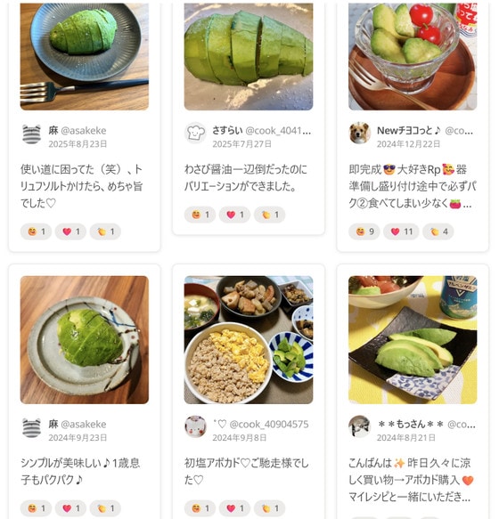 つくれぽ(つくりましたフォトレポートのこと)にも「塩だけでこんなに美味しくなるなんて!」「家族みんな塩アボカドがお気に入りになった」など、シンプルでおいしい塩アボカドレシピが大絶賛されています。