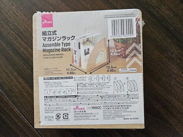 1つ目は木目調がおしゃれな「組立式マガジンラック」110円(税込)です!本を並べられる横幅は11.7cm、高さと奥行きは12.5cmあります。