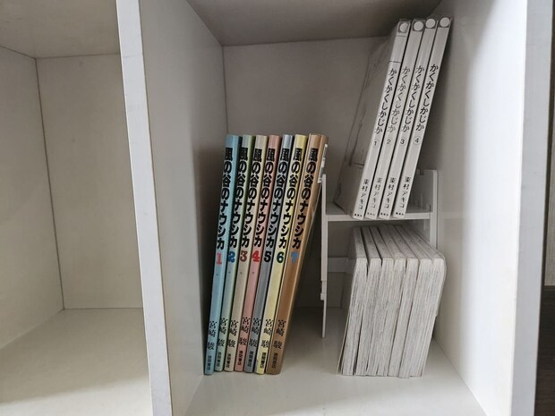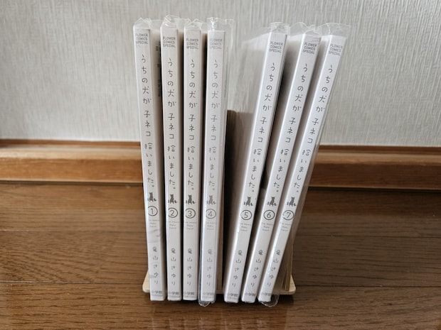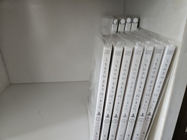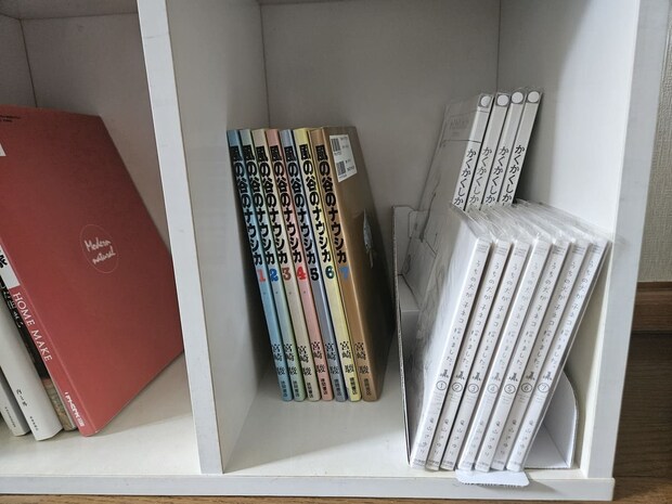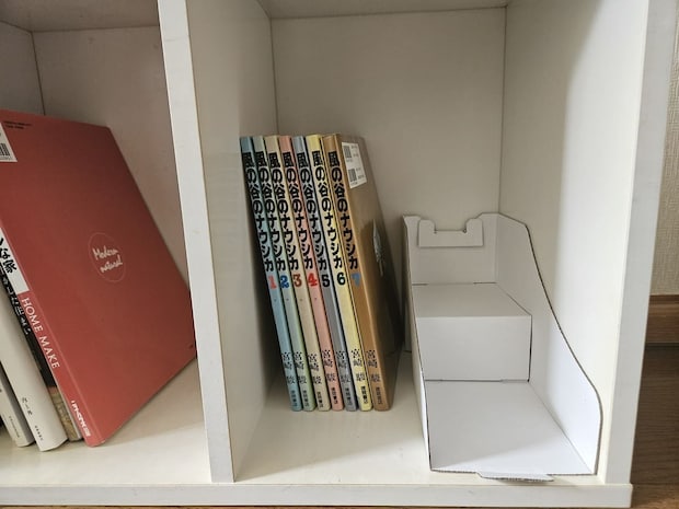こちらは一般的な漫画のサイズよりも厚みが少々薄いものになりますが、ラック半分に4冊がぴったり収まります!7冊しかありませんが8冊はきれいに収まるようです!