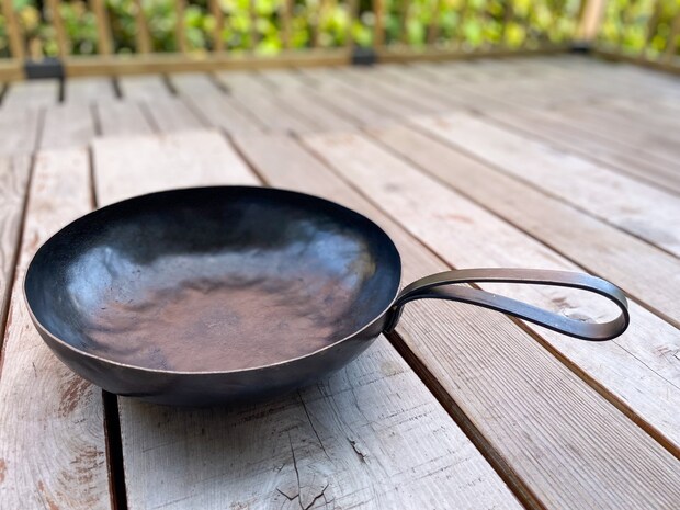 初めて我が家にお迎えしたのは、長野県に工房を構える鍛治職人 河原崎 貴(かわらざき たかし)さんの鉄フライパン。量産品にはなかなか見られないデコボコ感と、鉄のフライパンとしては軽量で扱いやすいところが気に入っています。