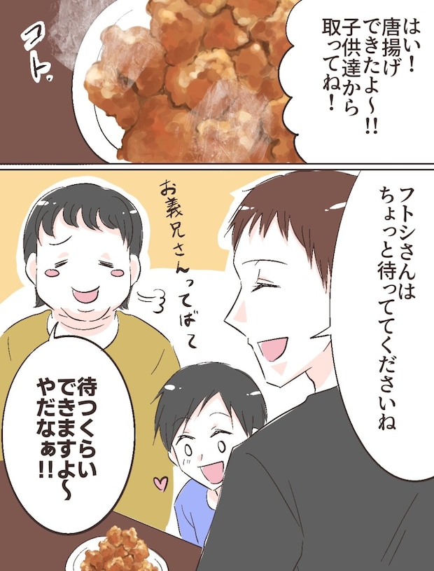 その後、食事の準備はどんどん進み、揚げたての唐揚げをヨシキさんがみんなのところへ運んでくれました。「フトシさんはちょっと待っててくださいね」とフトシに釘を刺しながらヨシキさんが子ども達の前に唐揚げを出すと、「待つくらいできますよ~。やだなぁ!!お義兄さんってば~」と笑いながら言うフトシ。