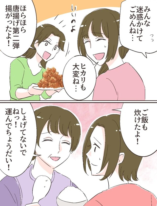 「みんな迷惑かけてごめんね・・」フトシの態度を謝る私に、姉たちは「いいのよ。ヒカリも大変ね・・」「ほらほら、唐揚げ第二弾揚がったよ!」と明るく言ってくれ、母も「ご飯も炊けたよ!しょげてないで。ねっ!はこんでちょうだい!」と私を励ますように言ってくれました。