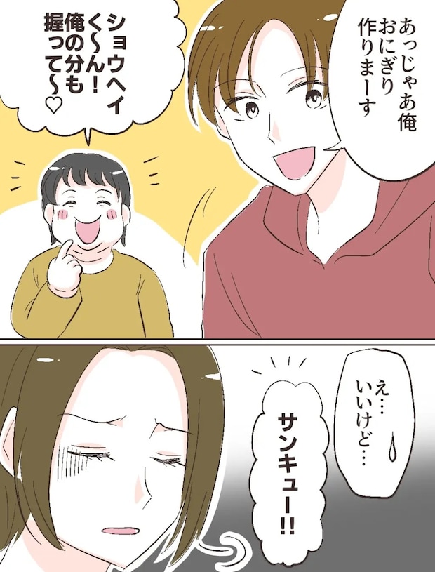 第二弾の唐揚げを運んでいき、お米も炊けたことを伝えると、ショウヘイ君が「あっ、じゃあ俺おにぎり作りまーす」と立ち上がりました。すると、すかさず「ショウヘイく~ん!俺の分も握って~!」と図々しく頼むフトシ。「え・・いいけど・・」と言うショウヘイくんにフトシは「サンキュー!!」と軽く言いました。自分では何もしないくせに誰よりも食べるフトシを本当に恥ずかしく思いました。おにぎりくらい甥っ子に頼まずに自分で握ってよ・・。もうため息しか出ません。