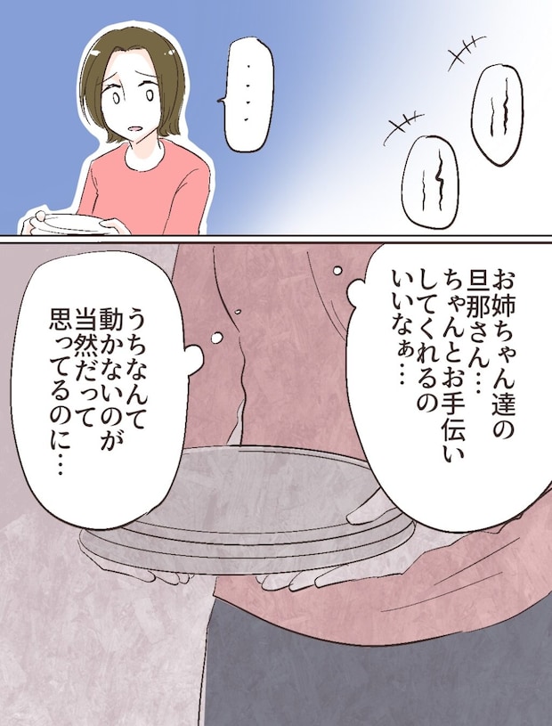 率先して食事を運んだりお皿を出したりする義兄たちの姿を見て「お姉ちゃん達の旦那さん・・ちゃんとお手伝いしてくれるのいいなぁ・・。うちなんて動かないのが当然だって思ってるのに・・」と一番動かないくせに失礼なことばかり言うフトシにモヤモヤ。