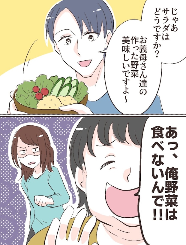 大人用の唐揚げを待つ間、「じゃあサラダはどうですか?お義母さん達の作った野菜おいしいですよ~」とヨシキさんがフトシにサラダを勧めてくれたのですが、「あっ、俺野菜は食べないんで!!」と笑顔できっぱり断るフトシ。そんなフトシを見てまたマミちゃんが引いています。