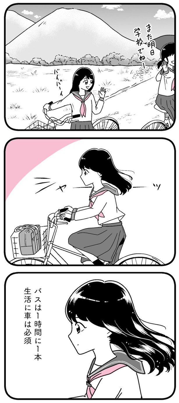 前回、バイトで疲れ果て自分が憧れていた東京の暮らしを送れず「なんで東京に来たんだっけ…」と自問する美春。美春が高校生まではバスは1時間に1本、車は生活に必須の田舎で暮らしていた。