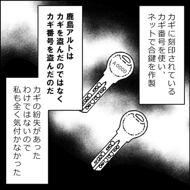 1年も前からレイの部屋に侵入を繰り返していた、元バイト仲間・アルトは逮捕されました。アルトはレイとバイトをしていた時に、女子更衣室にあったレイの鍵をスマホで撮影し、合鍵を作成していたのです。