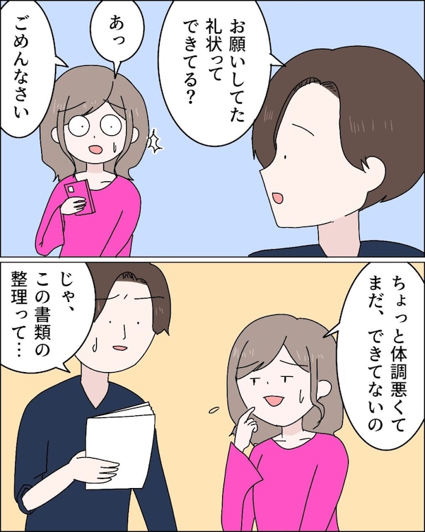 「お願いしてた礼状ってできてる?」ケイさんがそう言うと、「あっ、ごめんなさい」と謝るエリカさん。「ちょっと体調悪くてまだ、できてないの」と言い訳。「じゃ、この書類の整理って・・」と不安そうなケイさんに、