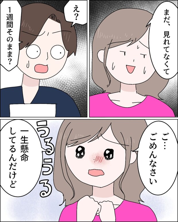 「まだ、見れてなくて」と焦りながら答えるエリカさん。「え?1週間そのまま?」とケイさんが驚くと、「ご・・ごめんなさい。一生懸命してるんだけど」と目をうるうるさせながらエリカさんが言いました。