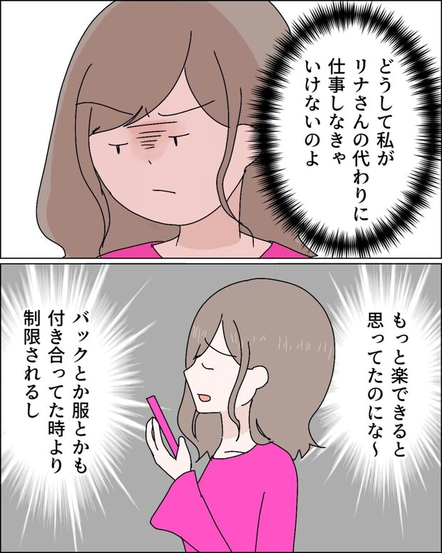 「どうして私がリナさんの代わりに仕事しなきゃいけないのよ」と不満そうなエリカさんは、「もっと楽できると思ってたのにな~。バッグとか服とかも、付き合ってた時より制限されるし」と不満が次から次へと溢れていました。