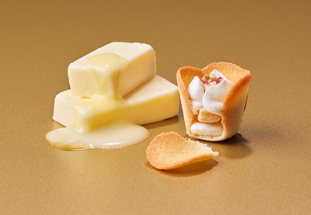 フランス産発酵バターが香るラングドシャクッキーに、塩バターキャラメル&ミルク仕立てのとろける生食感ショコラクリームをしぼった。隠し味には、塩味のパイを入れた。