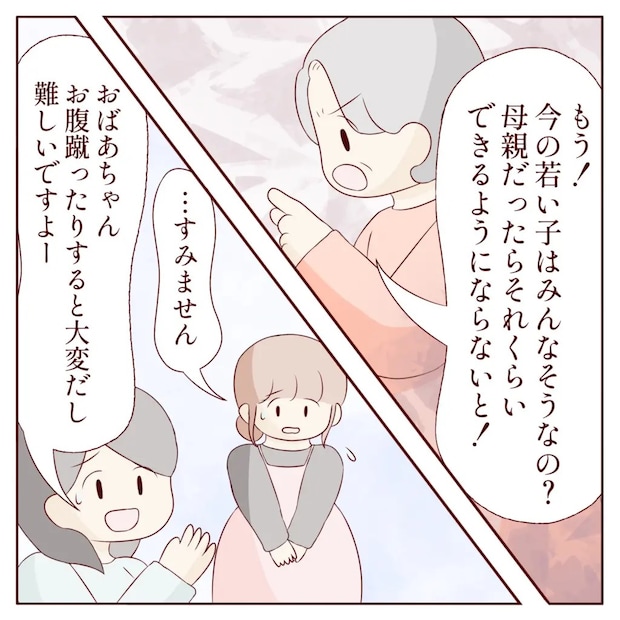 「今の若い子はみんなそうなの?母親だったらそれくらいできるようにならないと!」義祖母はヒナさんを執拗に責め立てます。するとカナコさんが、「お腹蹴ったりすると大変だし、難しいですよ」とフォローしてくれました。