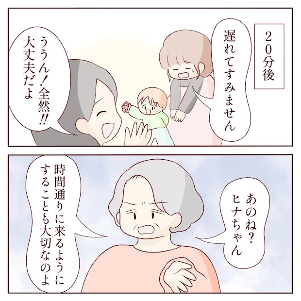 結局、約束の時間から20分遅刻してしまい「遅れてすみません」と深々と頭を下げるヒナさん。カナコさんは「ううん!全然大丈夫だよ」と優しく笑ってくれましたが、義祖母は「あのね?時間通りに来るようにすることも大切なのよ」とご立腹な様子。