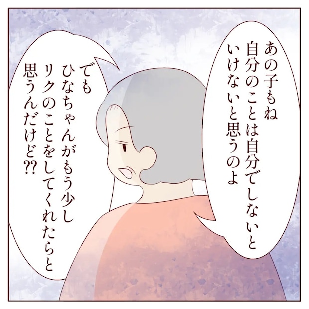 義祖母は背中越しにヒナさんを見ると、「あの子もね、自分のことは自分でしないといけないと思うのよ、でもヒナちゃんがもう少しリクのことしてくれたらと思うんだけど?」と言いました。