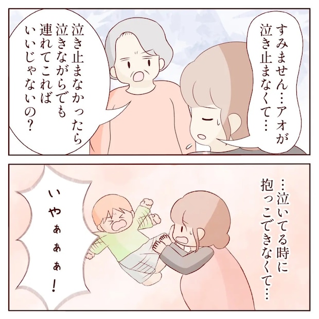 「すみません、アオが泣き止まなくて」ヒナさんが事情を説明しても、義祖母は「泣き止まなかったら泣きながらでも連れてこればいいじゃないの?」と責めるのをやめません。ヒナさんは、妊娠中の体で、暴れるアオを抱えてくるなんて無理・・・そう言い返したい気持ちをグッと飲み込みました。