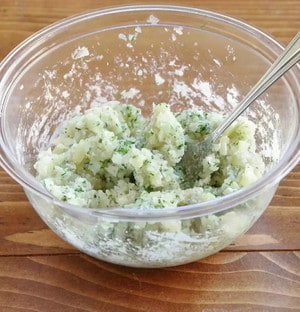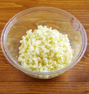 1. じゃがいもをみじん切りにして、耐熱ボウルに入れ、電子レンジで加熱します。加熱が終わったら、粗くつぶしましょう。