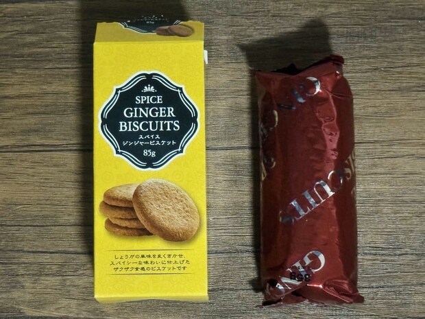 開封すると、ダークブラウンのビスケットと共に、ショウガの香りがほのかに漂います。