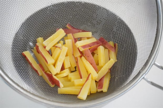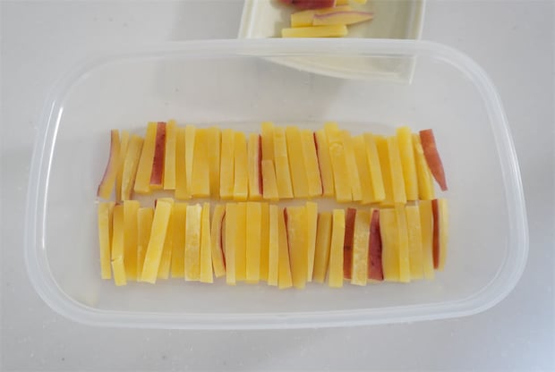 2. さつまいもをザルに上げて、容器に敷き詰める。