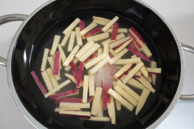 1. さつまいもは皮付きのまま長さ4cm、幅5mm角の拍子木切りにして鍋に入れる。そこに[A]を加えて7分ほど煮る。