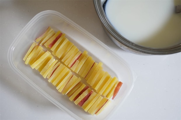 さつまいもの並べ方はお好みでOK。きれいに並べても寒天液を入れる際にズレてしまうので(涙)、ここはあまり気にしなくても良さそうです。