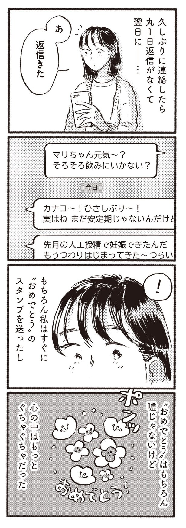 2025年11月24日 【漫画】友人からの妊娠報告に素直に「おめでとう」が言えない?37歳子ナシ女子の胸中/子どもが欲しいかわかりません(11) WEBザテレビジョン フリーライターのカナコは、マッチングアプリで出会ったリョウと結婚して5年目。今まで心から「子どもが欲しい」と思ったことは無かったが、「高齢出産」と呼ばれる年齢に差し掛かったことで、気持ちと向き合うことに。友人や家族、夫との会話を通して、カナコは「自分にとっての幸せ」について考えていく…。 子どもの有無を手がかりに様々な幸せと出会っていくコミックエッセイ、「子どもが欲しいかわかりません」(著・大町テラス)から、全23回連載でお届け。今回は第11回となる。