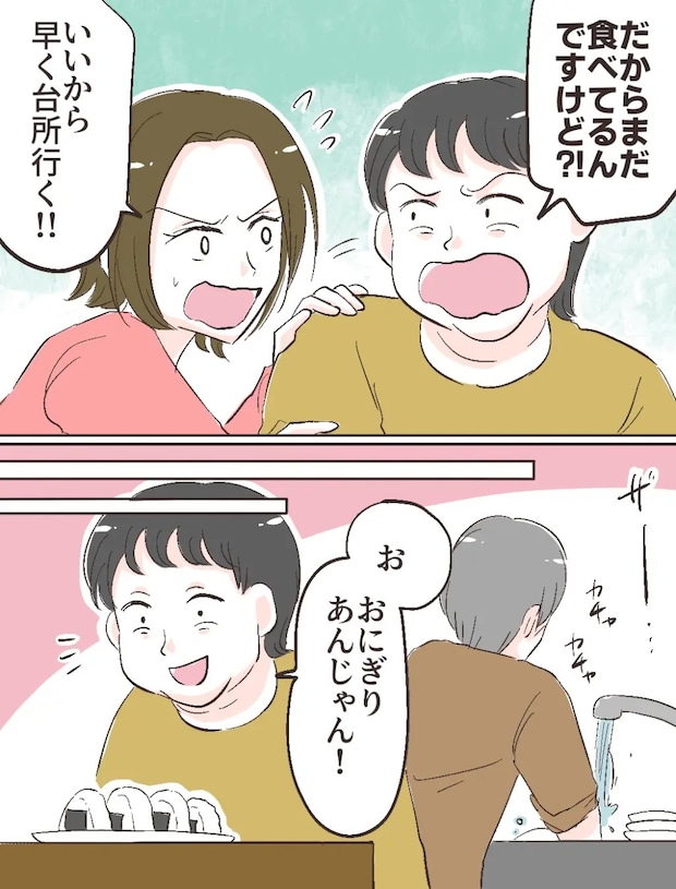 「だからまだ食べてるんですけど!?」と抵抗するフトシの背中を押し、「いいから早く台所行く!!」とキッチンに押し込もうとしました。渋々キッチンに行ったフトシは、お父さんが皿洗いをしているのには気づきもせず、テーブルの上におにぎりを発見!「お、おにぎりあんじゃん!」と目を付けると、